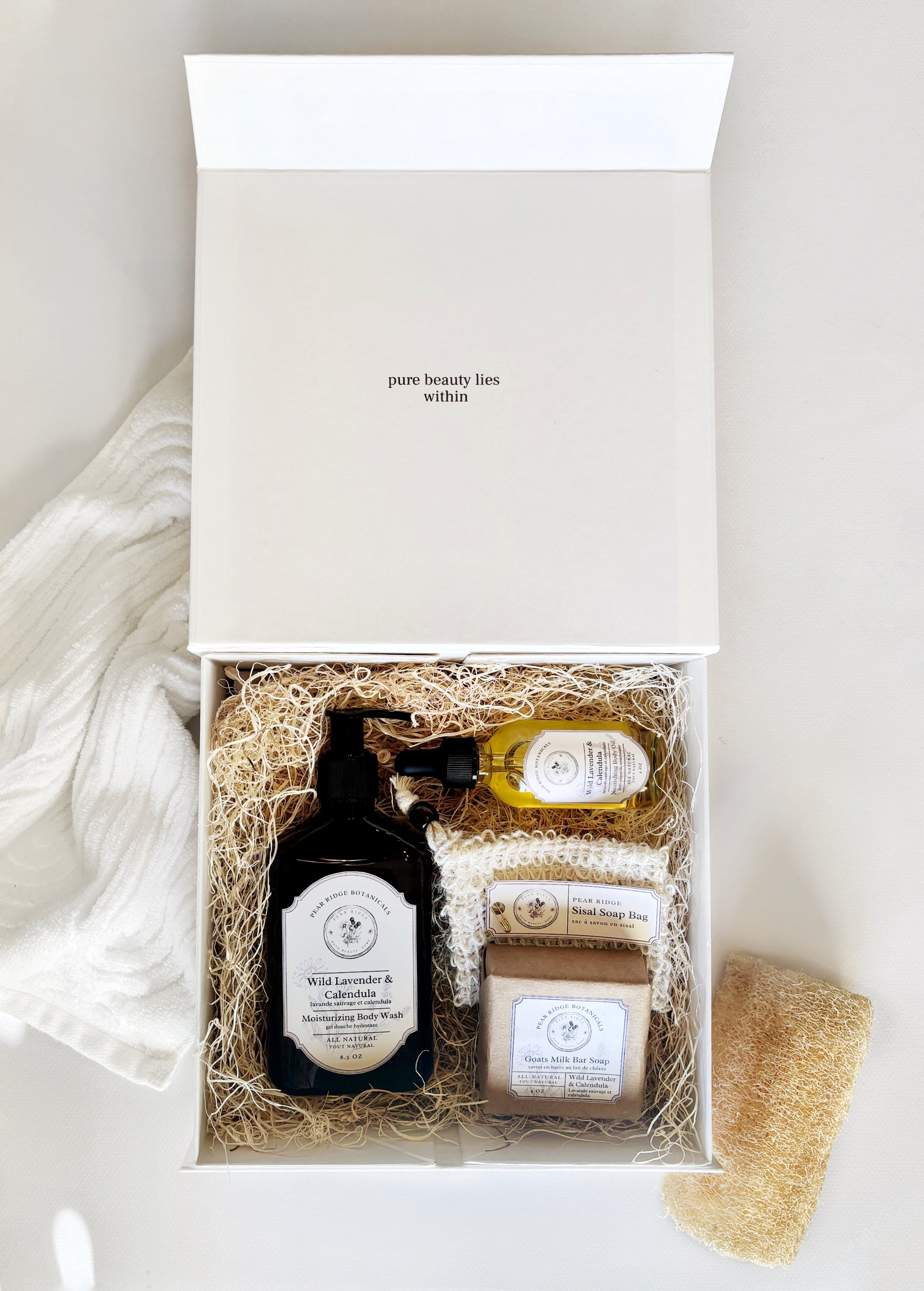 Our Signature Gift Set is a thoughtfully curated collection of Pear Ridge essentials, designed to transform daily routines into moments of everyday luxury. Each box arrives beautifully presented, with every detail intentionally chosen and crafted with our unwavering commitment to purity, quality, and understated elegance. From the first unwrapping to the final use, this collection is an expression of care, thoughtfully given, or intentionally kept for yourself.
